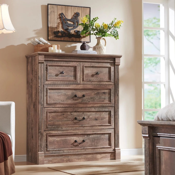 - [Modern Farmhouse Style] - Featuring natural wood grain and Roman column, this bedroom dresser exudes rustic charm and a timeless sophistication that effortlessly complements any decor. Its refined beveled edges and stylish drawer fronts enhance its vintage aesthetic, adding an element of grace to your home.