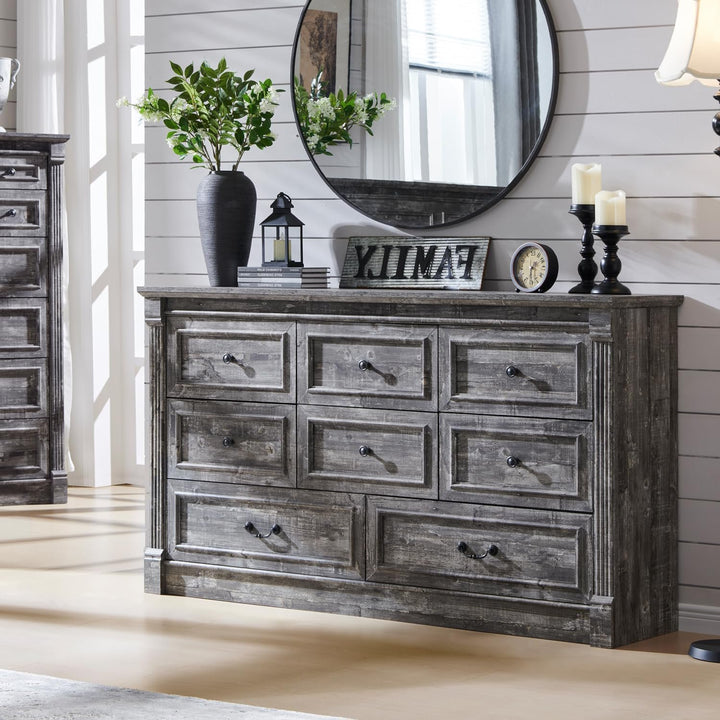61" Farmhouse Dresser with 8 Drawers, Rustic Wood Closet Storage with Roman Column for Bedroom