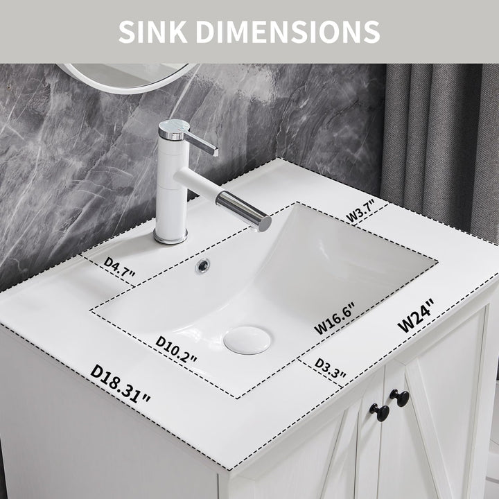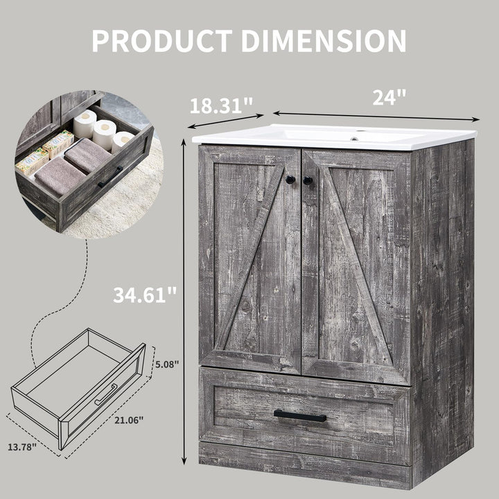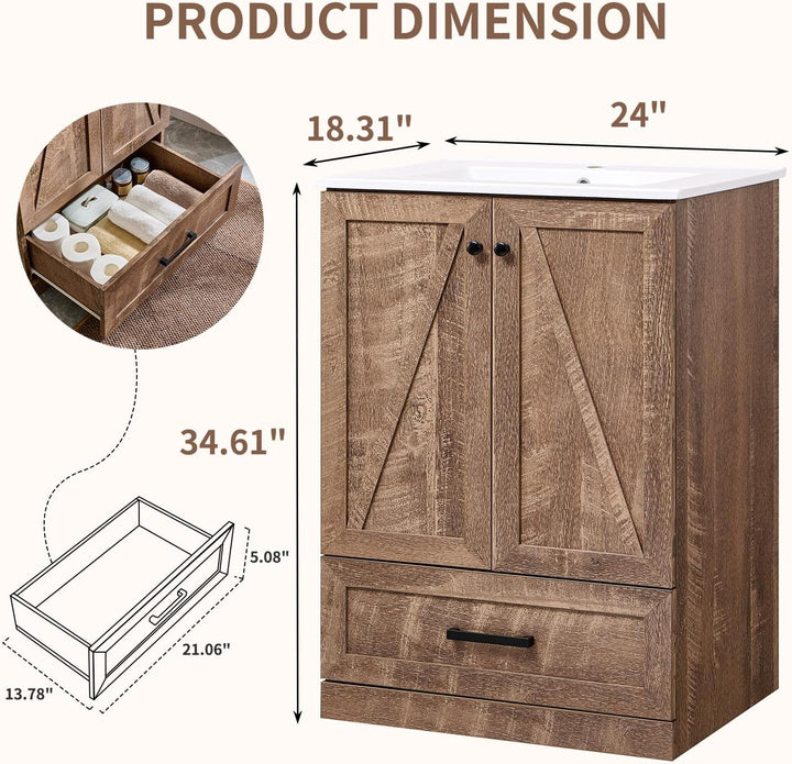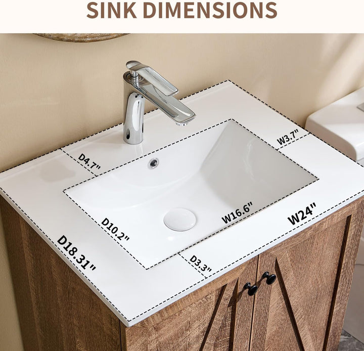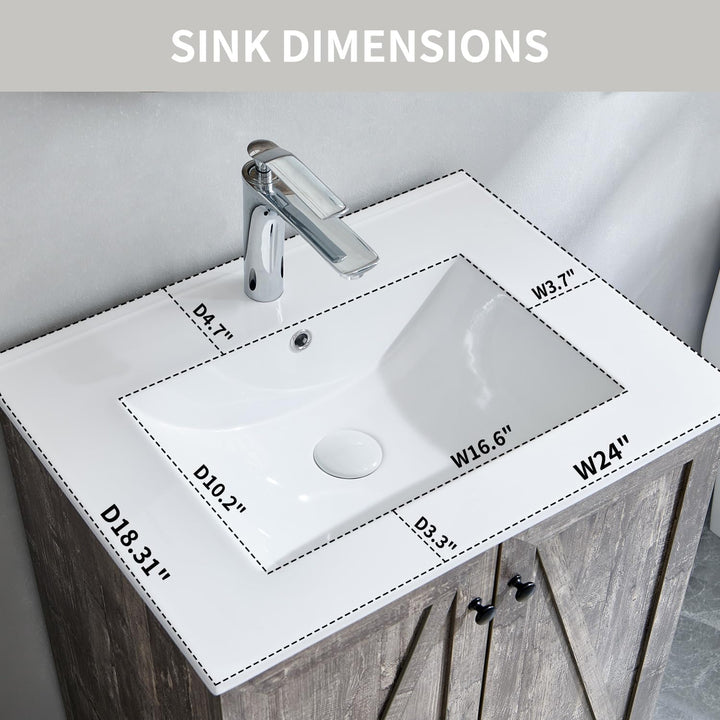 - 24" FARMHOUSE BATHROOM VANITY: Overall Dimension: 24" W x 18.31" D x 34.61" H. Sink dimension: 16.6" W x 10.2" D. Bathroom Vanity With Sink is made of quality MDF. Bathroom Vanity features a wood grain finish with a subtle texture that adds elegance and modern farmhouse style. Aitjunz Bathroom Vanity are made to last, suitable for any bathroom