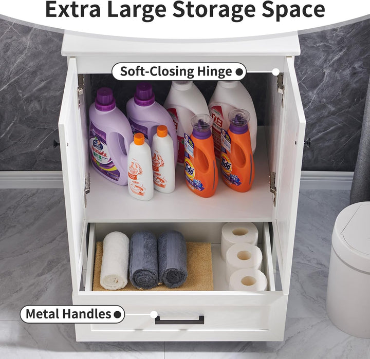 - THOUGHTFUL DESIGN: Bathroom Vanity Door with Sink features a Soft-Closing Hinge mechanism that ensures a quiet and smooth closure without making any noise, even when closed quickly. Smooth tracks and hinges are made of sturdy and durable hardware to ensure long-term reliability for everyday use. The modern black Metal Handles feature a water-resistant coating that prevents rust