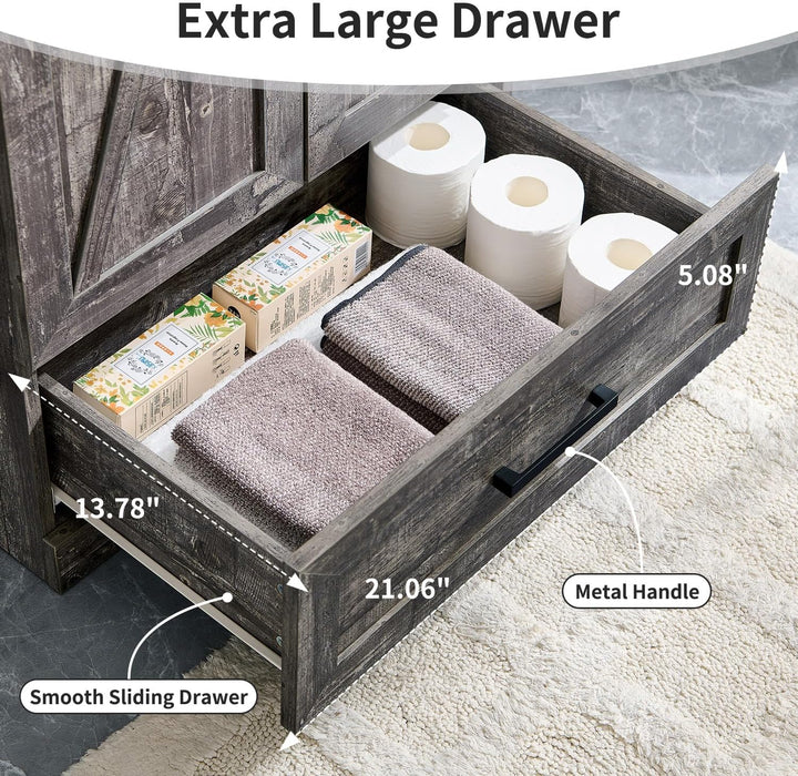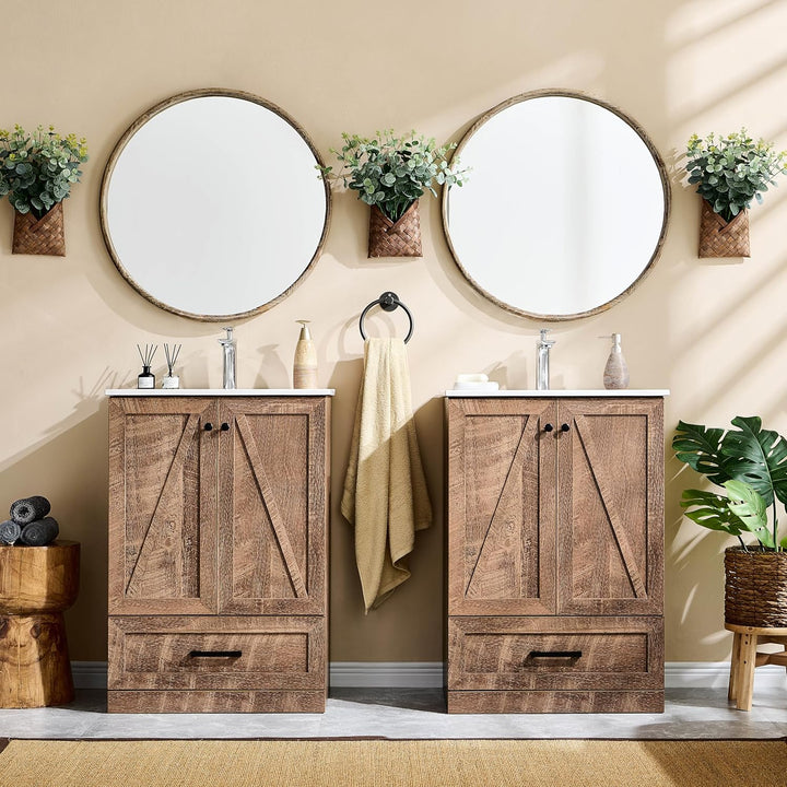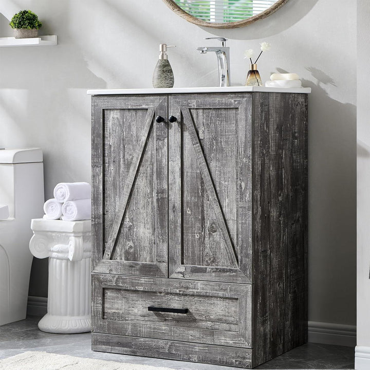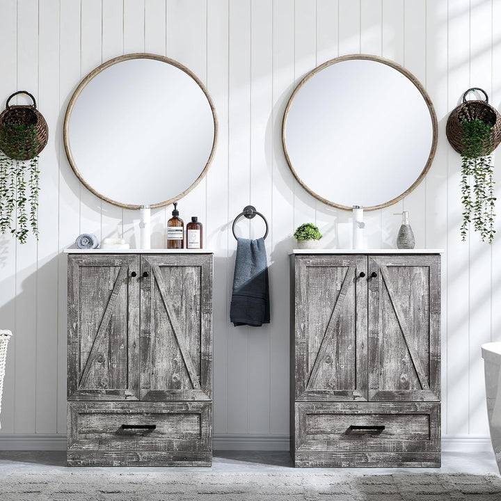 The Athletgo 24" Farmhouse Bathroom Vanity with Sink combines style and functionality for a modern yet rustic bathroom upgrade. Featuring a classic barn door design, it adds a charming farmhouse aesthetic to your space. The vanity includes a large storage drawer for organized essentials and is equipped with soft-closing mechanisms for quiet, smooth operation. Durable metal handles ensure long-lasting use, while the floor-standing design offers stability and versatility. Perfect for small to medium-sized bathrooms, this vanity is ideal for those seeking a blend of practicality and timeless design. Elevate your bathroom with the Athletgo Farmhouse Vanity—where elegance meets everyday convenience.