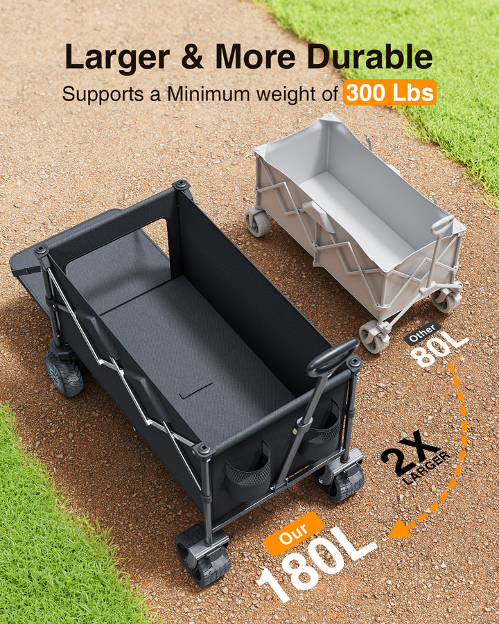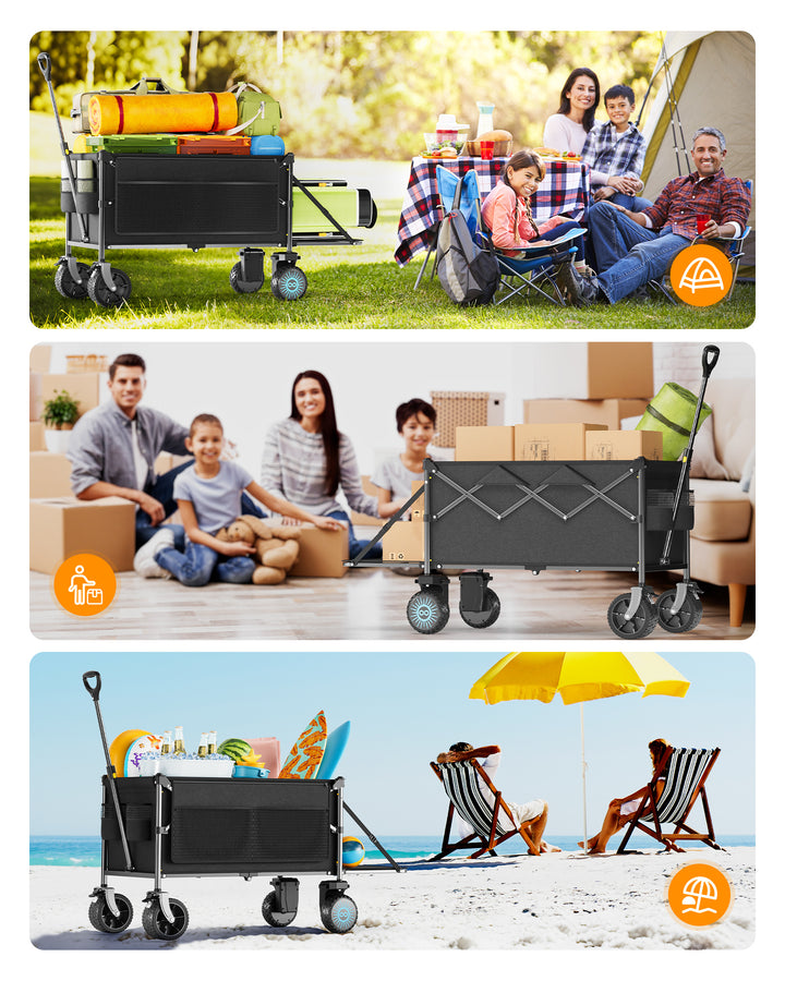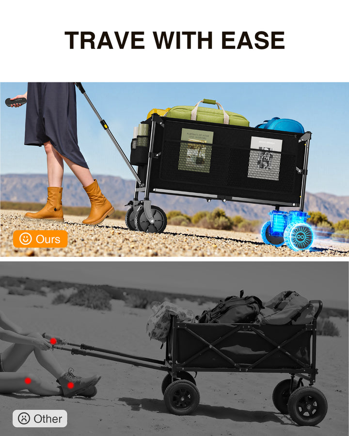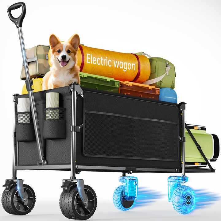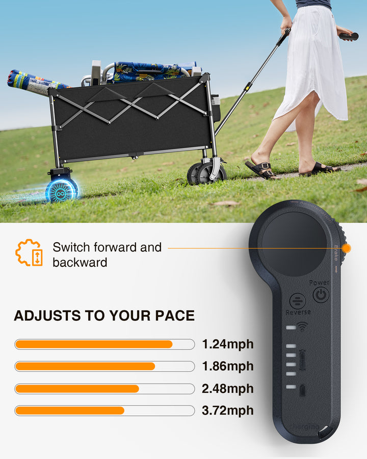 - 【Electric Camping Wagon】This electric collapsible wagon with 4 adjustable speed levels adapts to various paces. Dual electric and manual modes fit outdoor camping, picnics and more scenarios effortlessly.