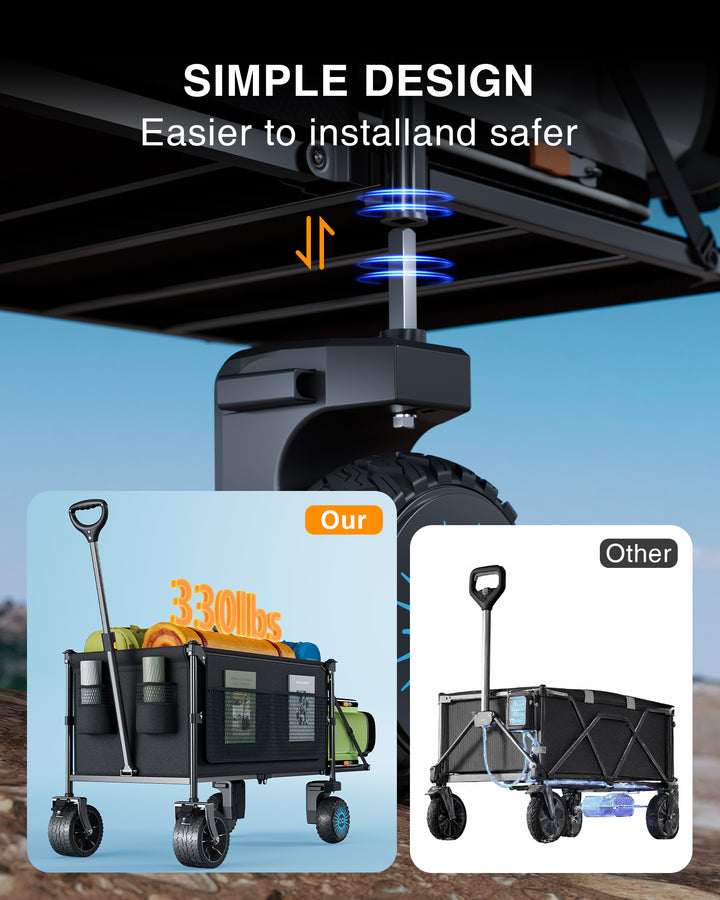 - 【330Lbs Load & Remote Control】Boasts a maximum load capacity of 300 lbs, easily hauling camping supplies. Comes with a remote control for convenient operation, simplifying your outdoor transportation.