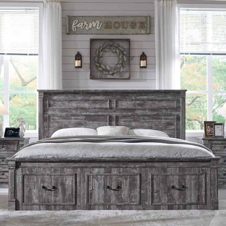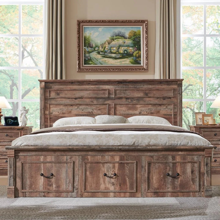 - MAXIMIZE STORAGE SPACE: The chic Wood Platform Bed Frame blends farmhouse beauty with the practicality of storage space. Featuring elegant Roman post accents on the footboard, this farmhouse style bed frame adds both storage and a touch of timeless charm to your bedroom. With three Large Drawers in the footboard, this farmhouse-style bed with storage frame maximizes storage space and is perfect for storing bedding, clothing and other essentials, reducing dust when storing items