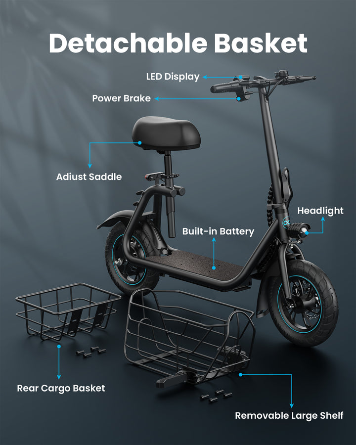 - SPACIOUS STORAGE: Featuring a large detachable middle basket and a small rear basket, this scooter offers ample storage space, making transportation of bulky items a breeze. Wide Deck: The 9.5" wide deck offers plenty of room for your feet or even a small pet. Shock-Absorbing Tires: Equipped with thick and sturdy 12" tires that absorb most shocks, providing a smooth and comfortable riding experience.