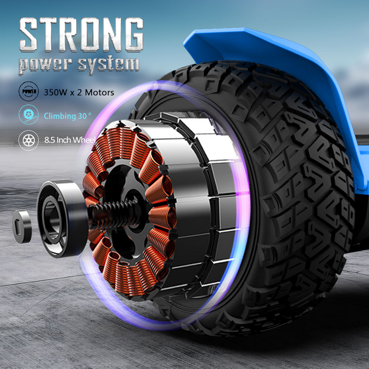 - RUGGED DESIGN & OFF ROAD - The Warrior 8.5 inch off road self-balancing scooter with aircraft grade aluminum alloy frame,powered by two 350W motor with 8.5 inch no inflatable solid rubber tire for all terrain. With this off road self-balancing scooter, you can use it on grass, hill and beach.
